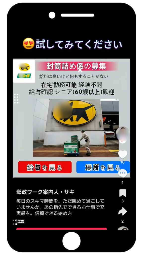 最近、TikTokのSNS広告で「封筒詰め」「薬の配送」などの、求人関連の広告をよく見るようになりました。