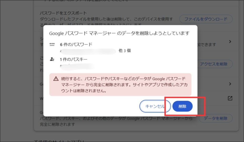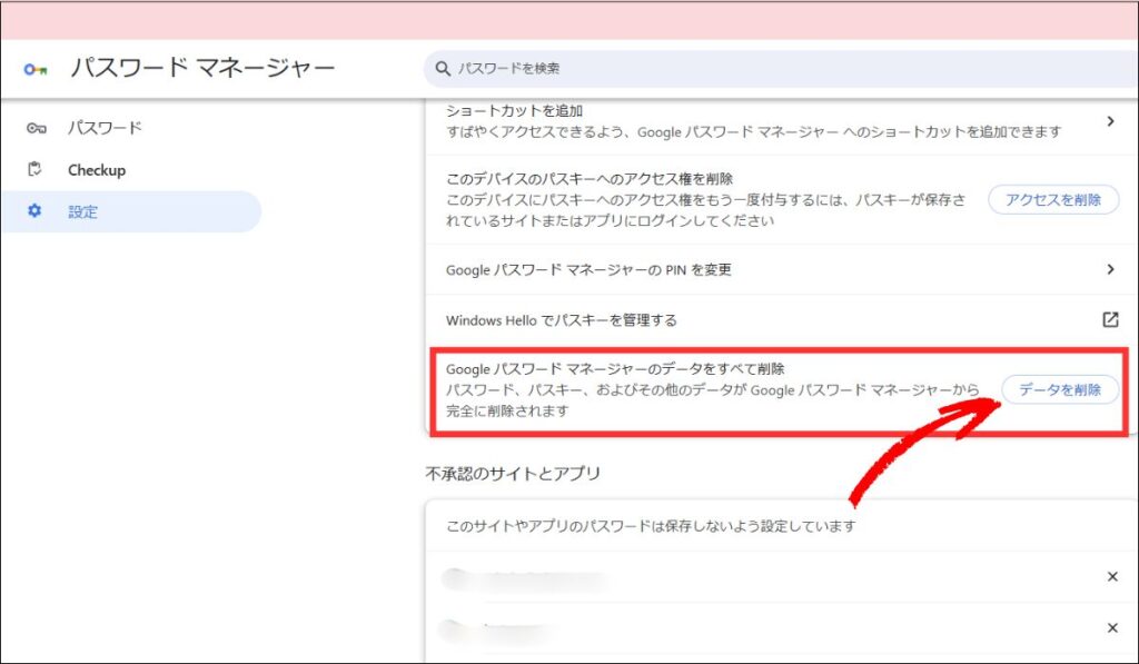 保存しているものをすべて削除したい場合は、「Googleパスワードマネージャーのデータをすべて削除」をクリック