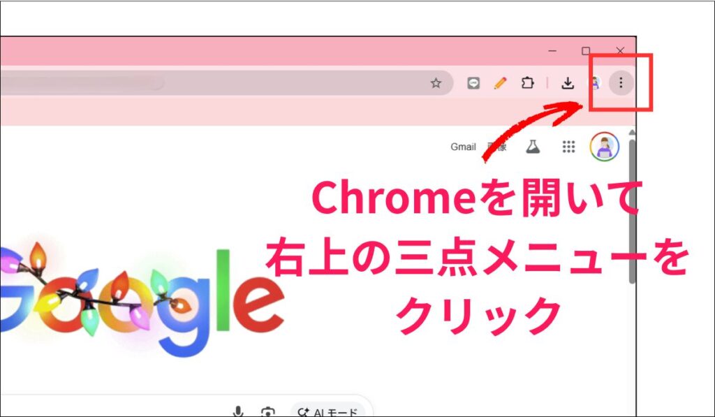 ①Googleアカウントにログインしている状態で、Chrome(クローム)を開き、右上の三点メニューに入ります。