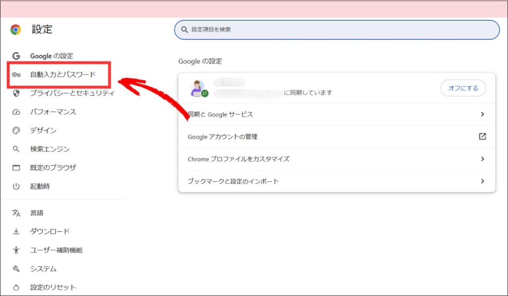②左側のメニューから、「自動入力とパスワード」をクリック