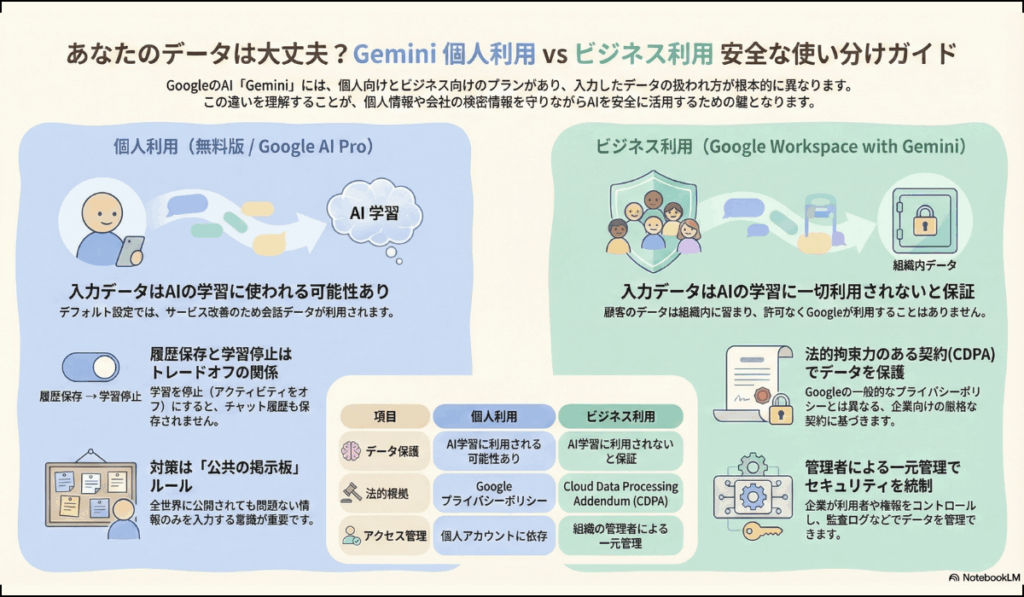 という場合は、Google Workspace(法人向け) を契約するのが安心です。法的契約でデータが保護され、AI学習に一切使われないと記載されています。