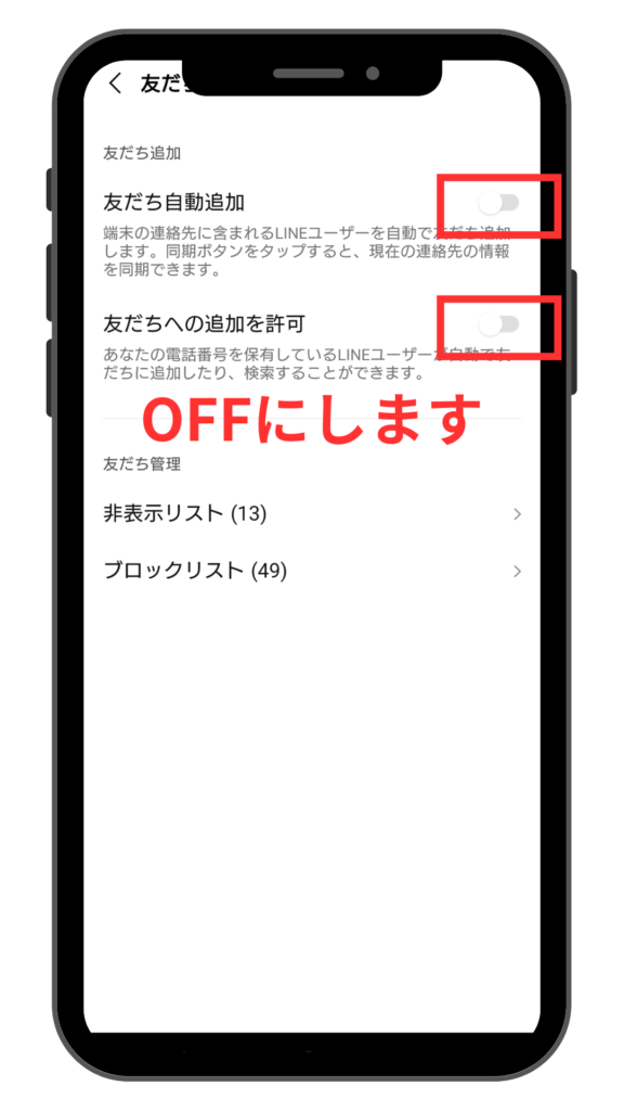 2、「友達自動追加」と「友達への追加を許可」、どちらもOFFにしておきましょう。