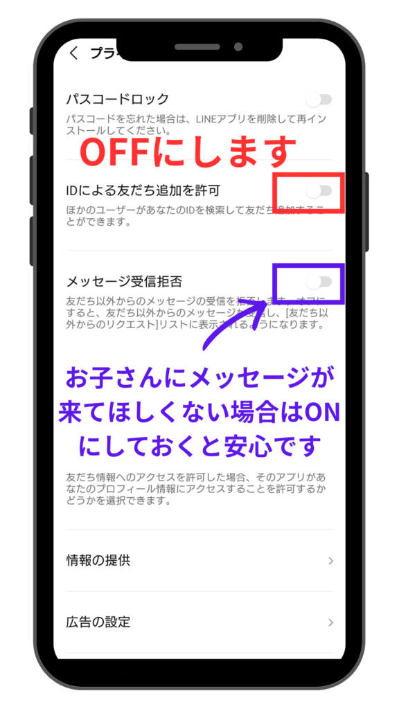 またお子さんの場合、知らない人からのメッセージを受け取らないようにしたい場合は、青い枠の「メッセージ受信拒否」をONにしておくと安心です。