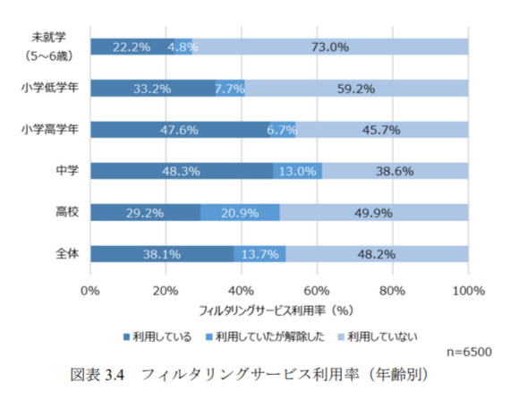 未就学児22.2%、小学低学年33.2%と、低年齢にも関わらず、フィルタリングサービス利用率が非常に低いのが分かります。大人のスマホを利用させている方が多いのも、要因でしょう。